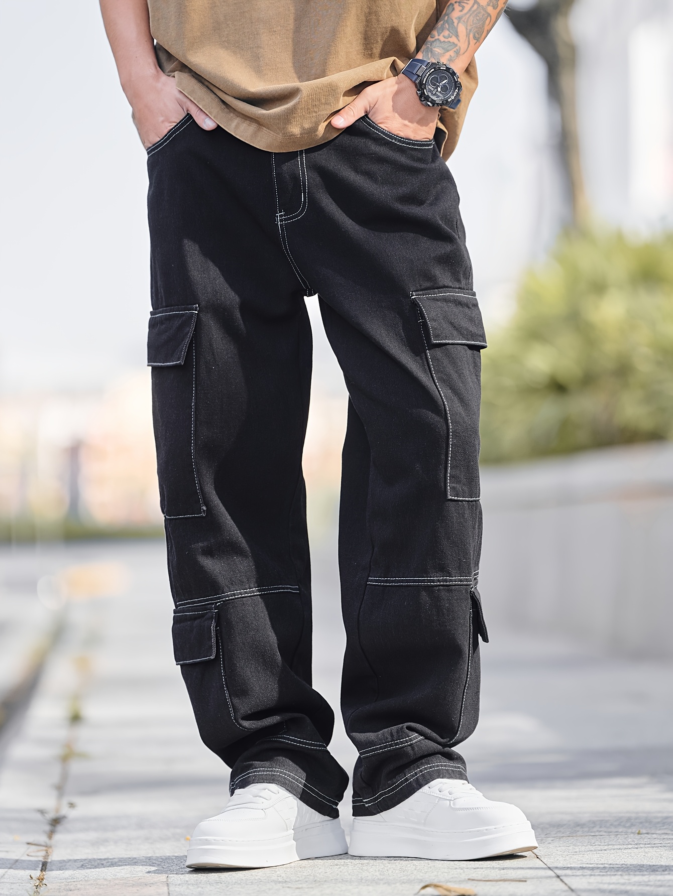 Men'S Street Style Cotton Blend Jeans, Loose Fit Straight Leg Denim Pants, Non-Stretch Solid Color, with Multiple Pockets, for All-Season Trousers