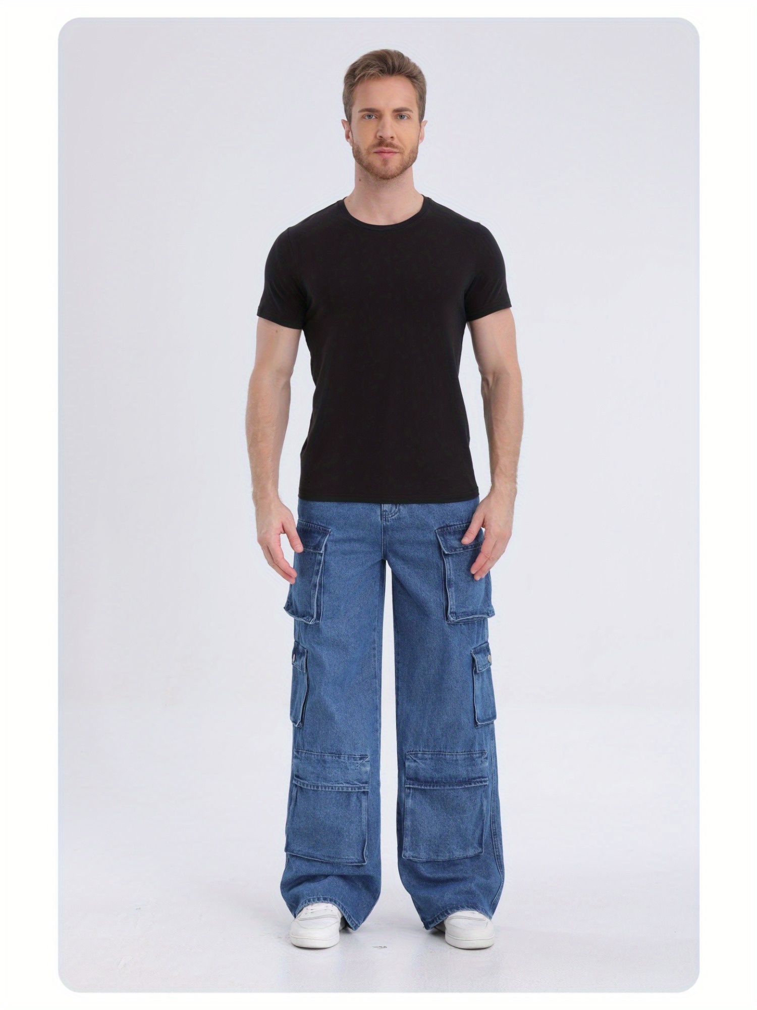 Enhance your daily look with these Men's Blue Multi-Pocket Denim Jeans. Tailored for the contemporary gentleman, these pants blend a relaxed fit with a straight-leg cut, striking a harmonious mix of ease and city chic. The lively blue color brings a fashionable touch, elevating these jeans to a key item in your closet. Equipped with numerous useful pockets, they offer plenty of space for your necessities, infusing a hint of functionality into their stylish appearance.