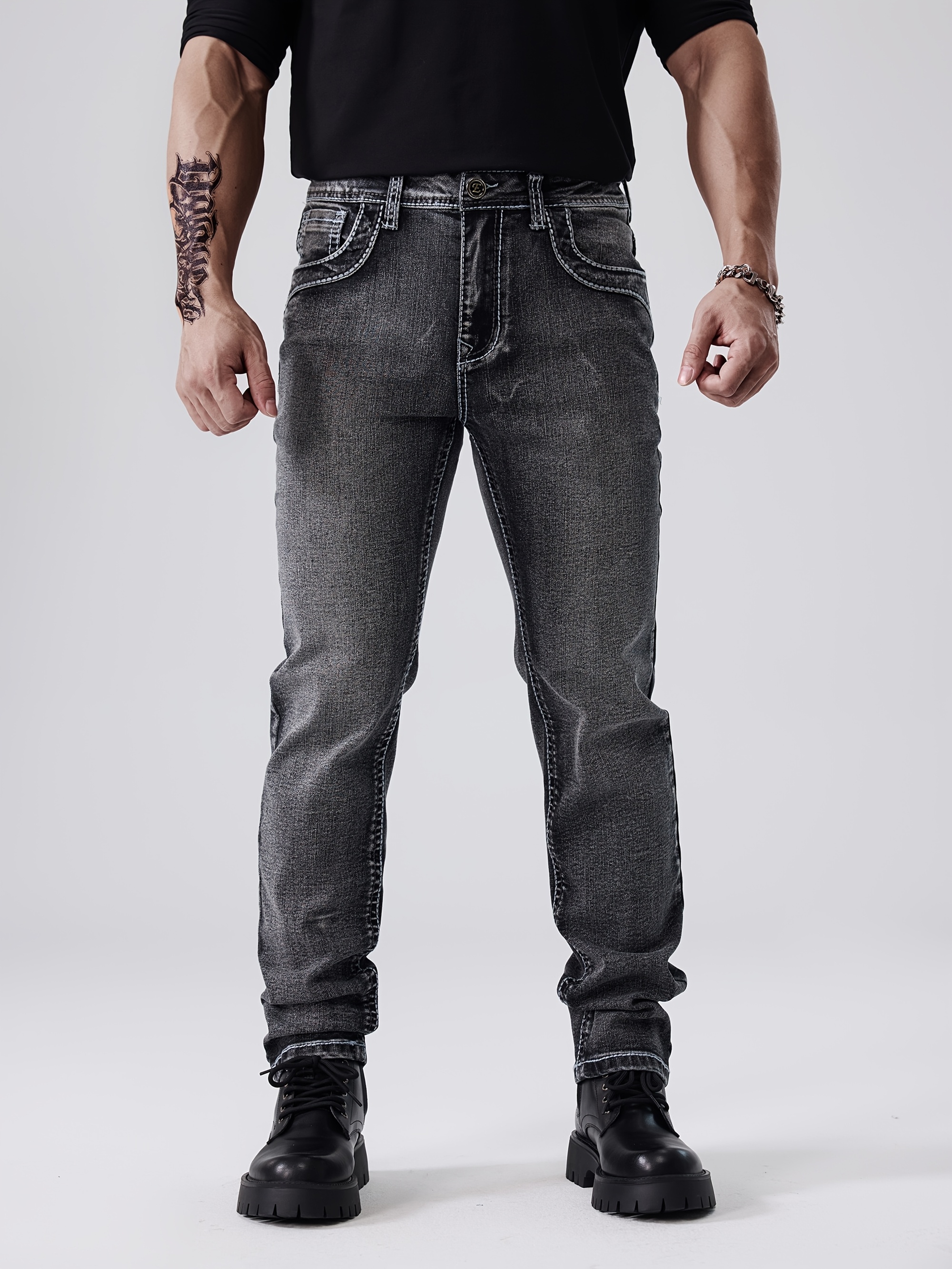ESDVQ Men's Vintage-Inspired Embroidered Stretch Jeans - Slim Fit, Cotton Blend Denim with Pockets