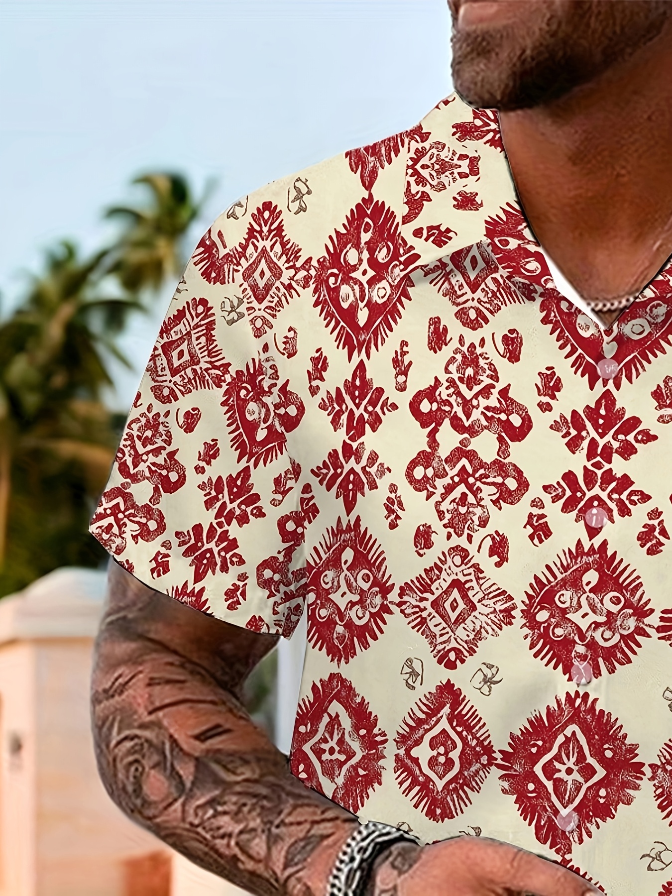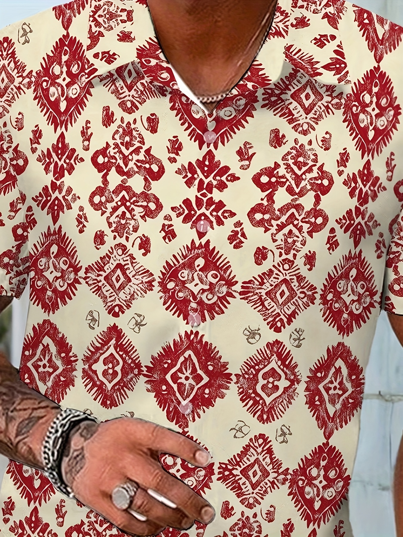 Men'S Summer Casual Print Button-Down Shirt, Polyester Fabric, Non-Stretch, Regular Fit, with Loose Hem, for Woven Lapel Collar Top