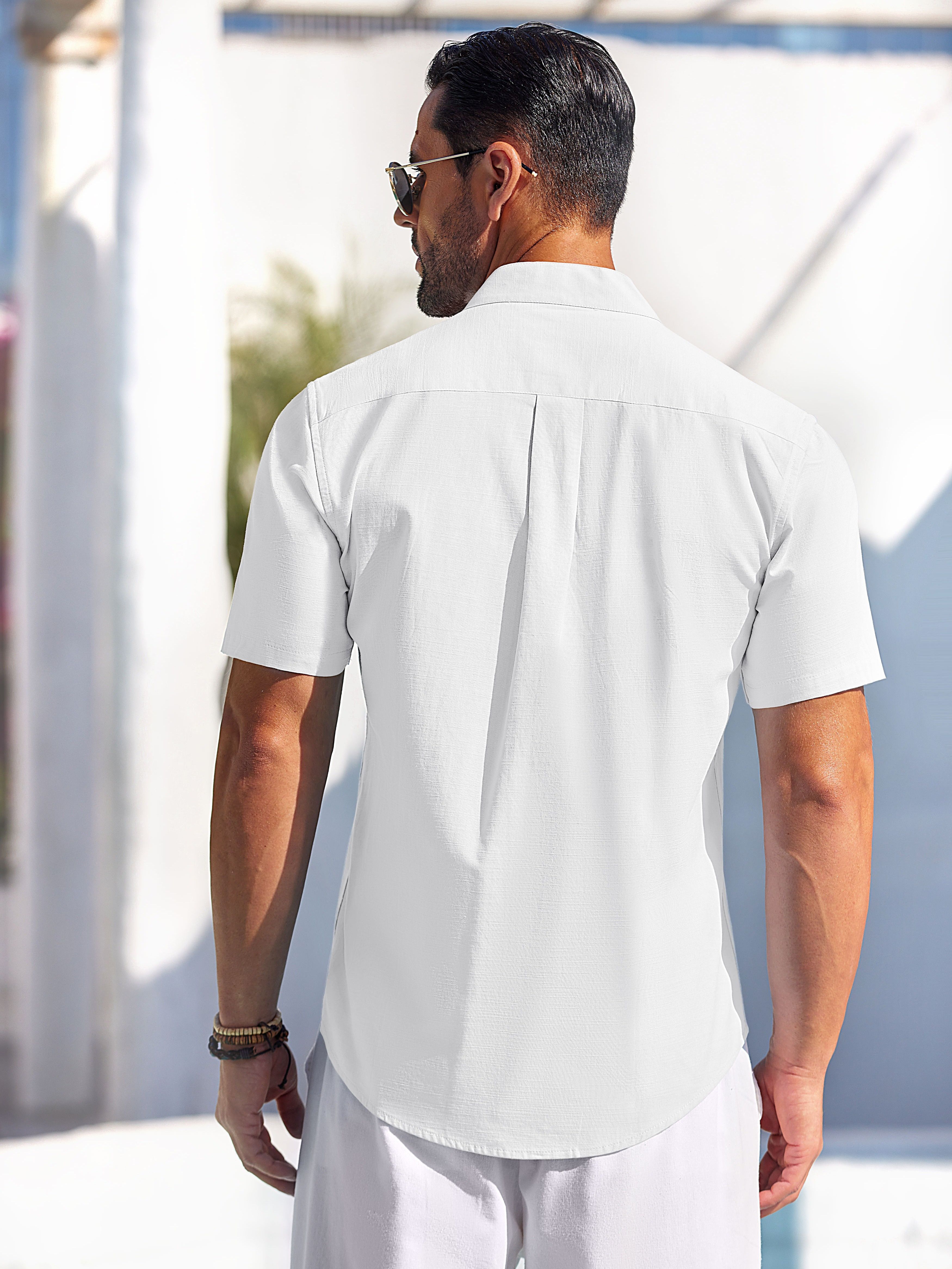 Men's Casual Button Down Cotton Shirts Short Sleeve Band Collar Beach Summer Shirt Tops