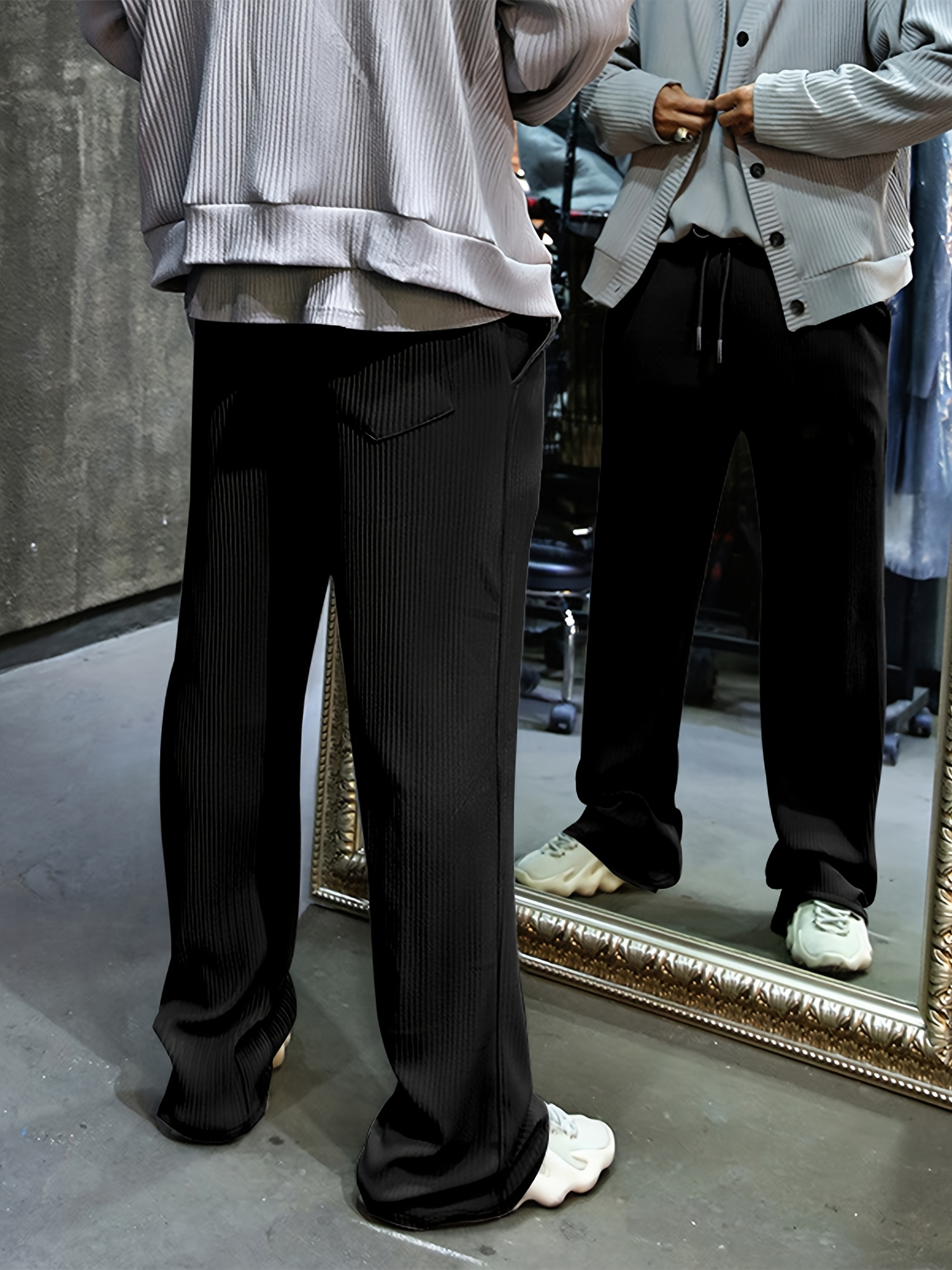 Men's Casual Drawstring Pants - Mid-Waist, Straight Leg, Solid Color Ribbed Design, Polyester Blend, Machine Washable