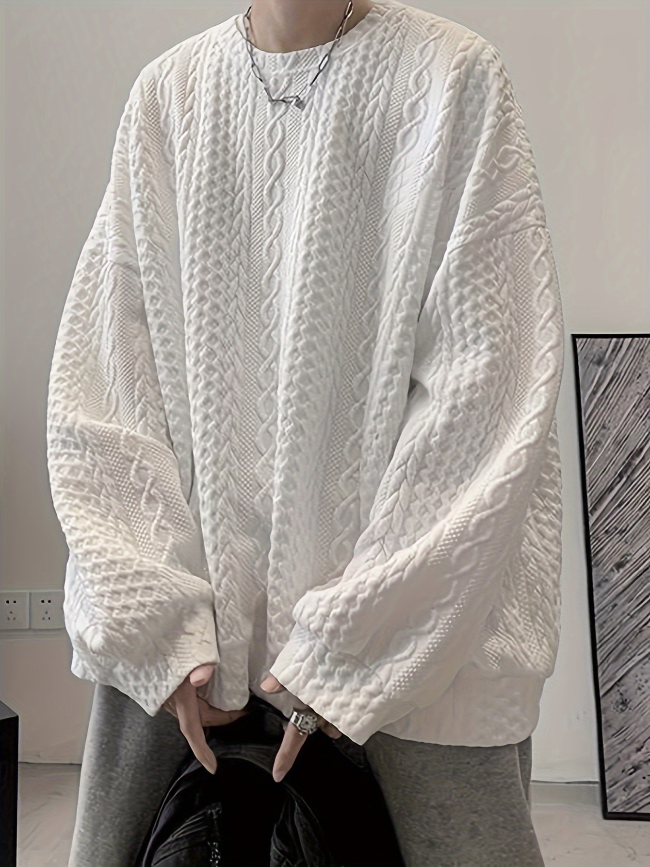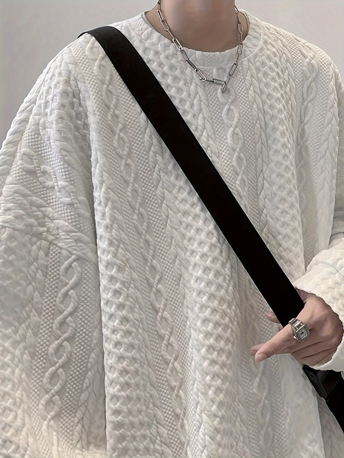 Trendy Cable Sweatshirt, Men's Casual Solid Crew Neck Sweatshirt For Men Fall Winter