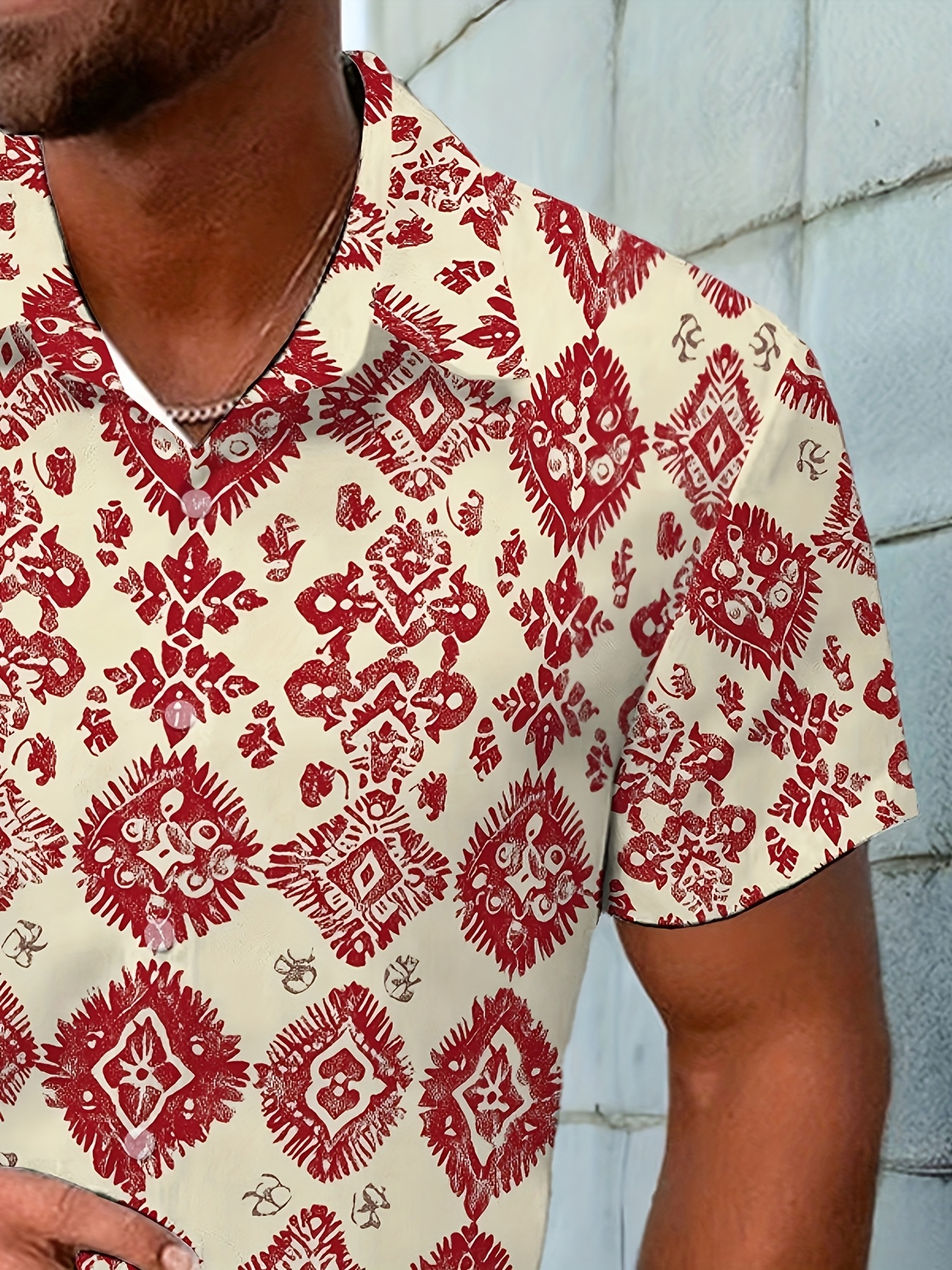 Men'S Summer Casual Print Button-Down Shirt, Polyester Fabric, Non-Stretch, Regular Fit, with Loose Hem, for Woven Lapel Collar Top
