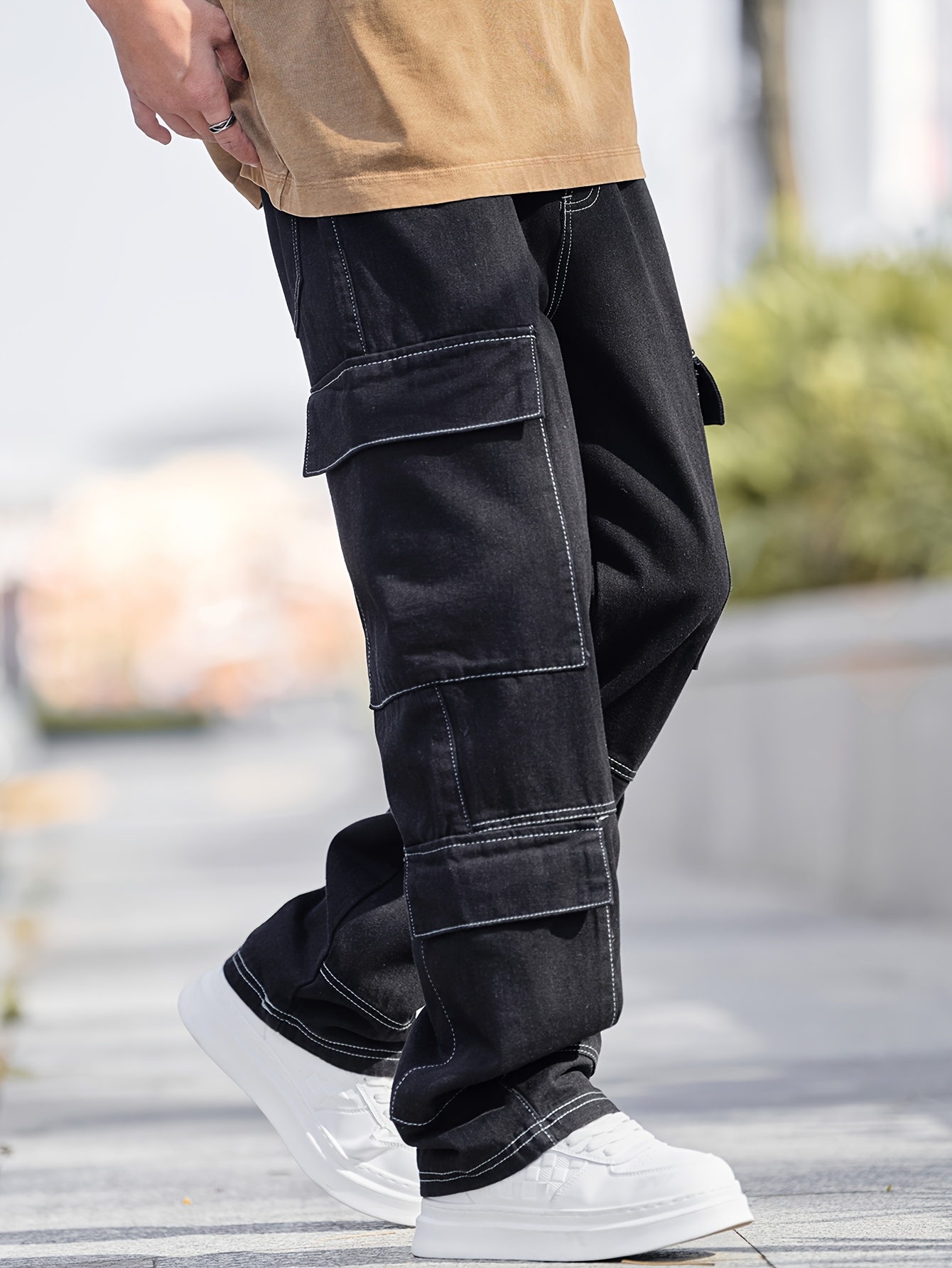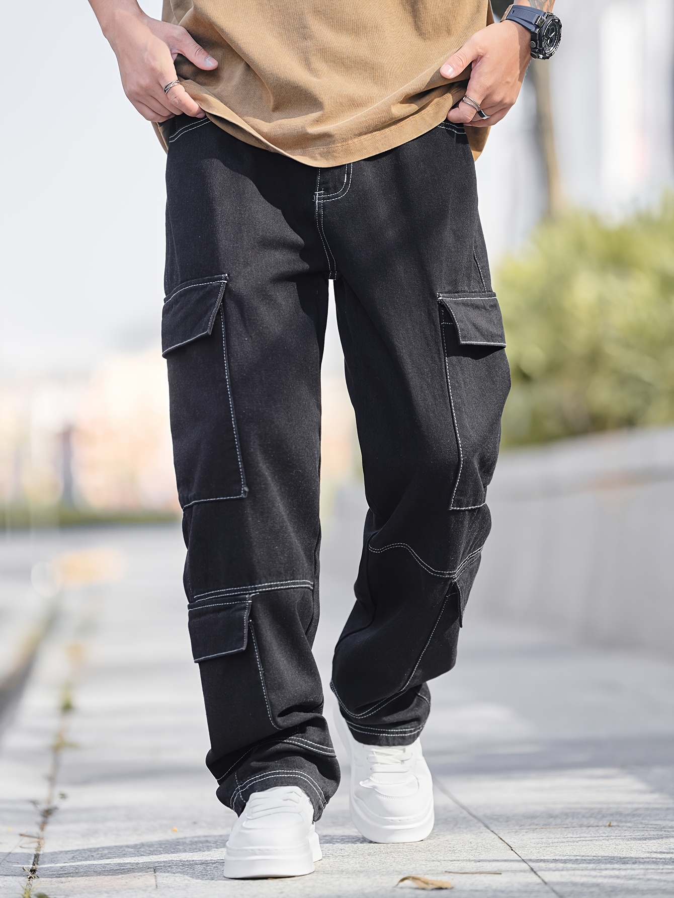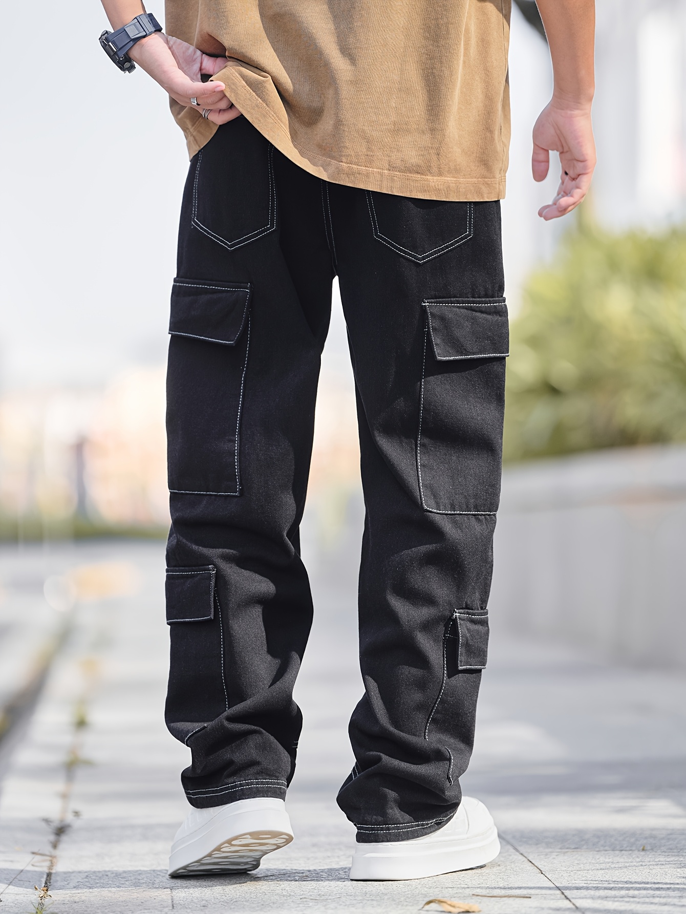 Men'S Street Style Cotton Blend Jeans, Loose Fit Straight Leg Denim Pants, Non-Stretch Solid Color, with Multiple Pockets, for All-Season Trousers